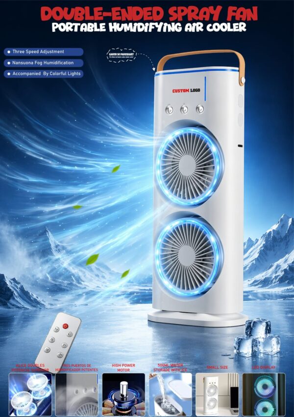 Double Ended Spray Fan, Cold Air, 2025 New 3 Gears USB Rechargeable Oscillating one with LED Light Cooler, Tower Air Coolers & Remote Control,Water Tank,Bedroom, Living Room
