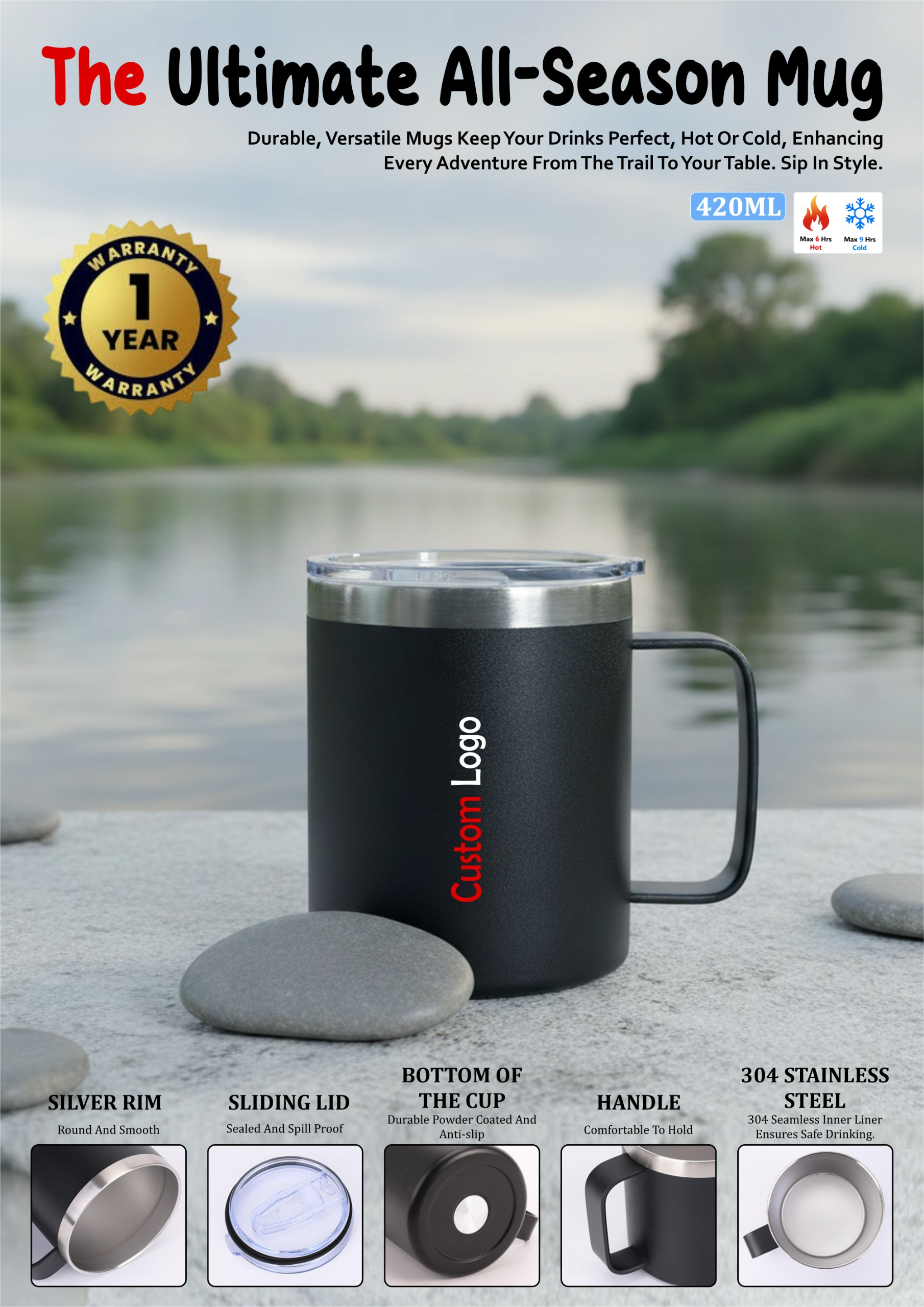• USE-FRIENDLY HANDLE: This insulated camping mugs with lids are designed with a humanized handle, which means our stainless steel camping mug is convenient for your life. Whether you drink hot coffee or iced water, whether you are camping outdoors or at home, this wide and use-friendly handle of our stainless steel tea cup with handle is perfect to grasp. No worry about burning or freezing.